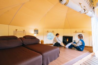 This special accommodation includes rooms suspended approximately three meters above ground, creating glamping in the forest. Enjoy Shinshu bean paste hot pot and barbecue in the adjacent dining area.